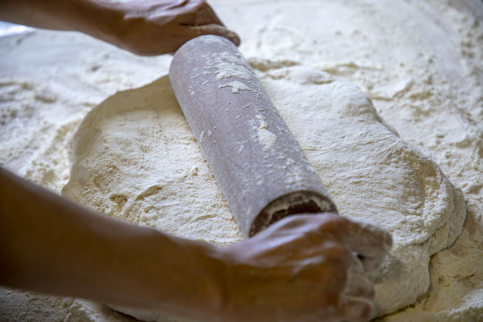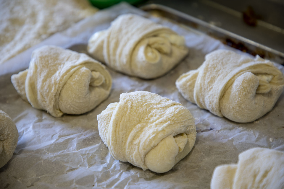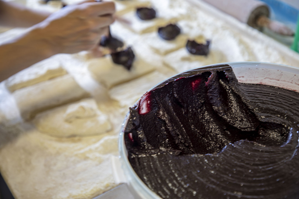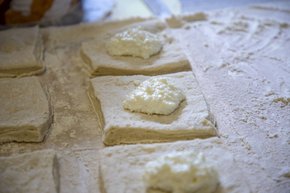 A je čas na plnku! Tvarohové buchty sú naozaj lokálne, pretože použitý tvaroh je z neďalekej Breznianskej mliekarne. Pozrite sa na to krásne cesto, ako je v ňom vidieť vrstvy masla. Tu u Falťanov vyrábajú buchty v rôznych príchutiach, napríklad aj čučoriedkové, malinové, a dokonca aj slivkovo-oškvarkové, ktorým som neodolal ani ja. Cesto sa takto pekne zavinie a nechá sa ešte chvíľu podkysnúť.Keď sa buchty pečú, ešte krásne nakysnú, a vznikne tak dokonale nadýchaná sladká pochúťka s nádhernou vôňou.