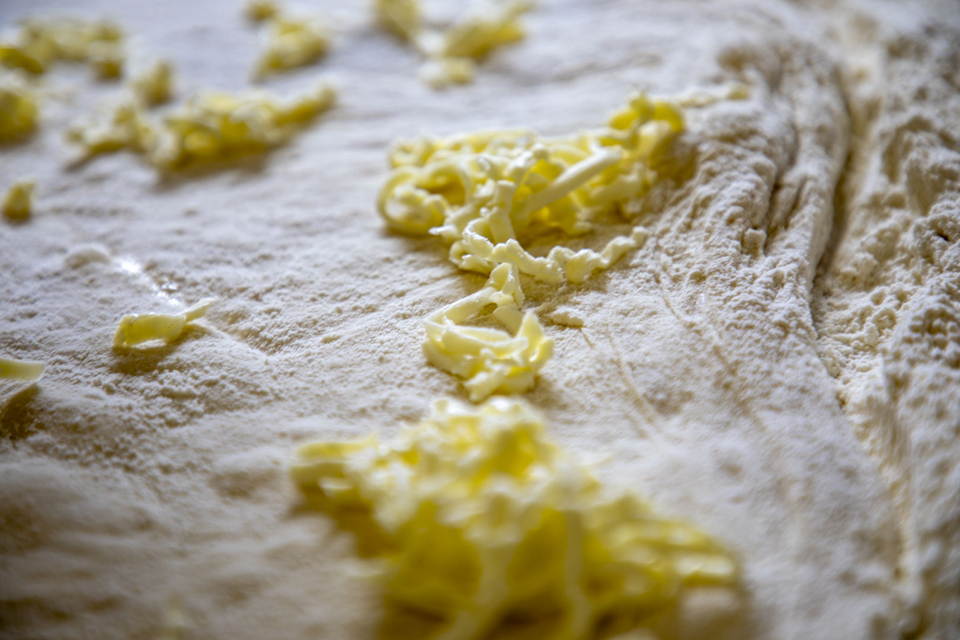 Základ je však kysnuté cesto, ktoré sa vyrába z múky, mlieka, vajíčok, cukru a kvasníc. Pravdepodobne sú tam aj ďalšie ingrediencie ? Presné zloženie cesta však nie je až tak podstatné. Keď cesto vykysne, je naozaj krásne nadýchané. Následne sa prekladá maslom. Úplne na začiatku, keď sa buchty piekli v obci Muráň, ako hlavný tuk sa používala masť. Avšak, ako hovorí Terka, skúšali to aj s masťu, avšak v upečených buchtách ho bolo dosť cítiť. Na vykysnuté cesto sa nastrúha maslo a následne sa cesto preloží. Nechá sa odpočinúť a rozvaľká sa.